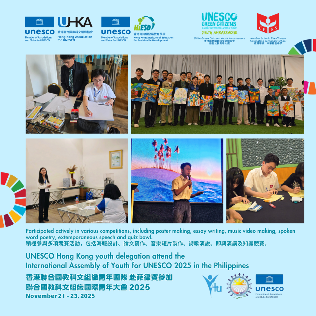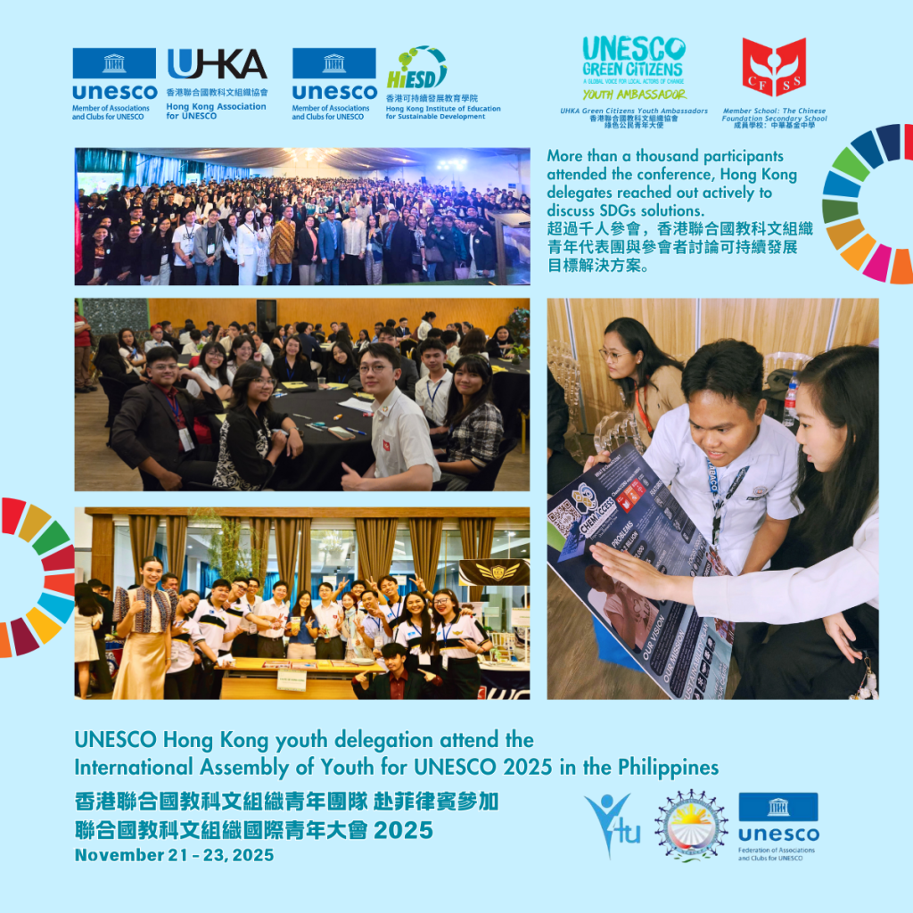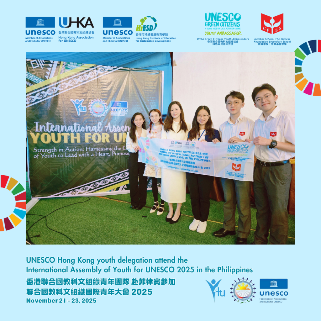 From November 20 to 23, the UNESCO Hong Kong youth delegation, comprising Green Citizens Youth Ambassadors, students, and teachers from its member school—The Chinese Foundation Secondary School—participated in the International Assembly of Youth for UNESCO (Y4U) 2025 in the Philippines.