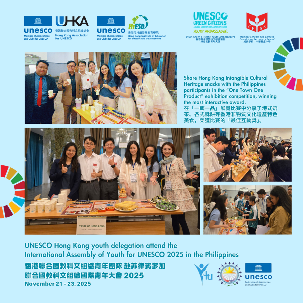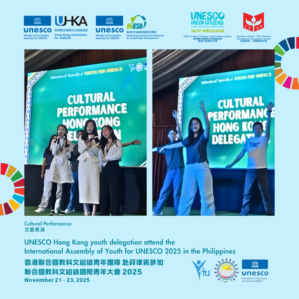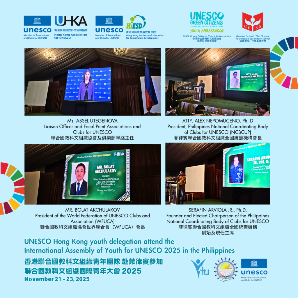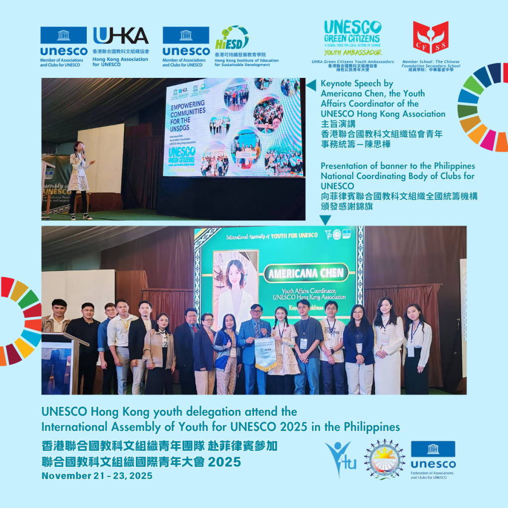 From November 20 to 23, the UNESCO Hong Kong youth delegation, comprising Green Citizens Youth Ambassadors, students, and teachers from its member school—The Chinese Foundation Secondary School—participated in the International Assembly of Youth for UNESCO (Y4U) 2025 in the Philippines.