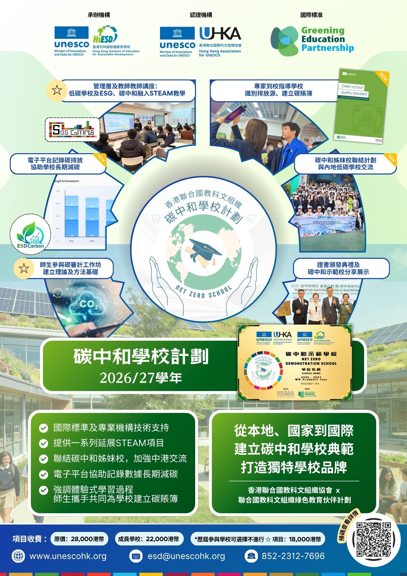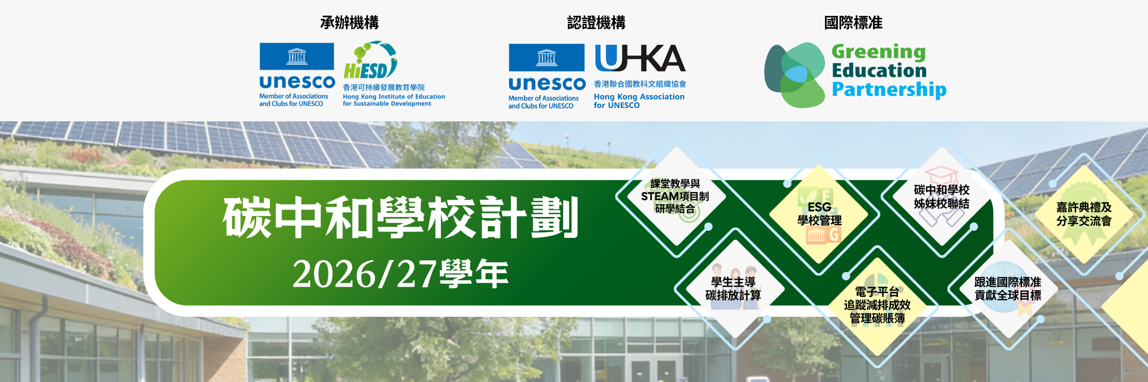 響應聯合國教科文組織「教育的未來」倡議及香港特別行政區政府《香港氣候行動藍圖2050》,「碳中和學校」旨在賦能教育機構,使其成為教育界推動可持續發展的先導和示範。2026/27學年的計劃將在過往成功的案例基礎上,進一步將低碳原則、低碳文化、硬件和軟件融入學校管理及課程,將校園轉變為氣候行動的實驗室。